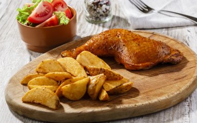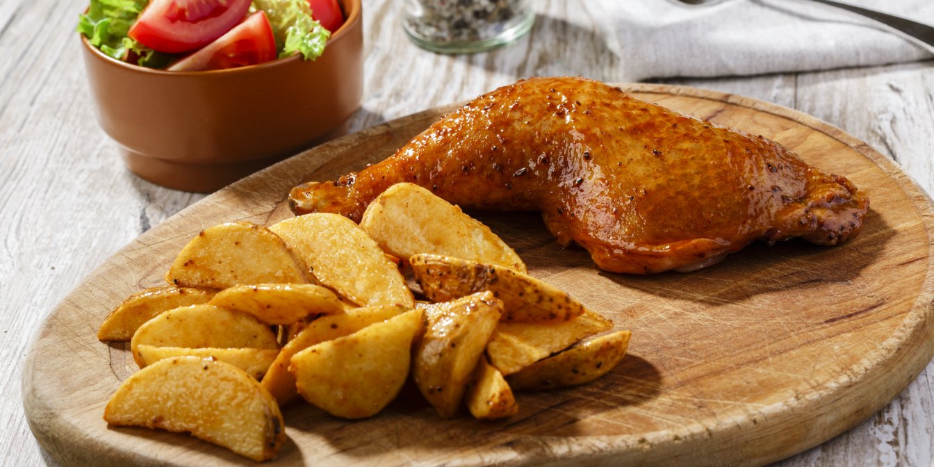 Предлагаем простой рецепт, который поможет накрыть стол за достаточно небольшое время. Подавайте к курятине с картофелем свежие овощи или салаты.