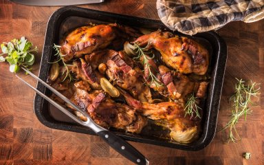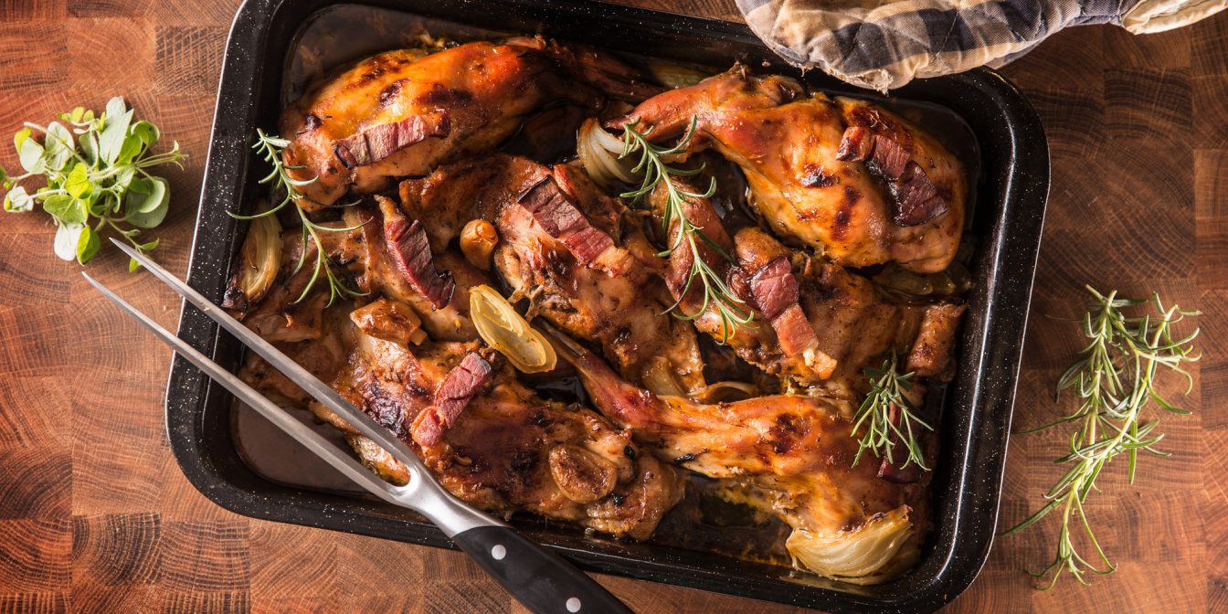 SHUBA предлагает взять тушку небольшого молодого кролика — его мясо будет мягким и особенно нежным. Вы можете добавить паприку, майоран, орегано, острый перец. Посолить блюдо лучше перед запеканием в духовке.