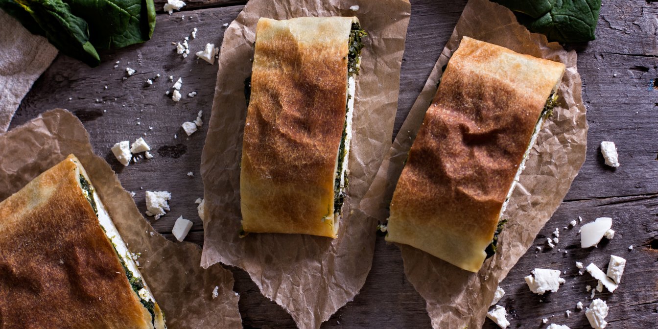Для начинки этого штруделя из слоеного теста мы выбрали сочетание, которое популярно в Греции — шпинат и фету. На рецепт нас вдохновил известный пирог спанакопита, который в этой стране можно купить где угодно.