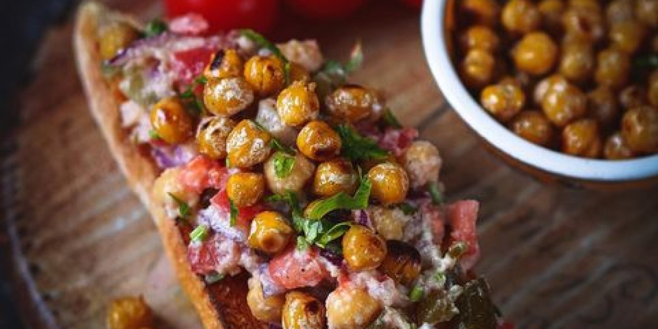 Это не только оригинальная закуска. Салат, который кладется на хлеб, вполне может стать отдельным сытным блюдом. Перед тем, как начинать варить нут, замочите его на несколько часов, а лучше на ночь.