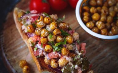 Выложить салат на поджаренный хлеб, сверху выложить поджаренный хрустящий нут. Украсить зеленью.