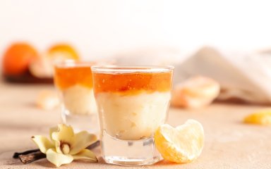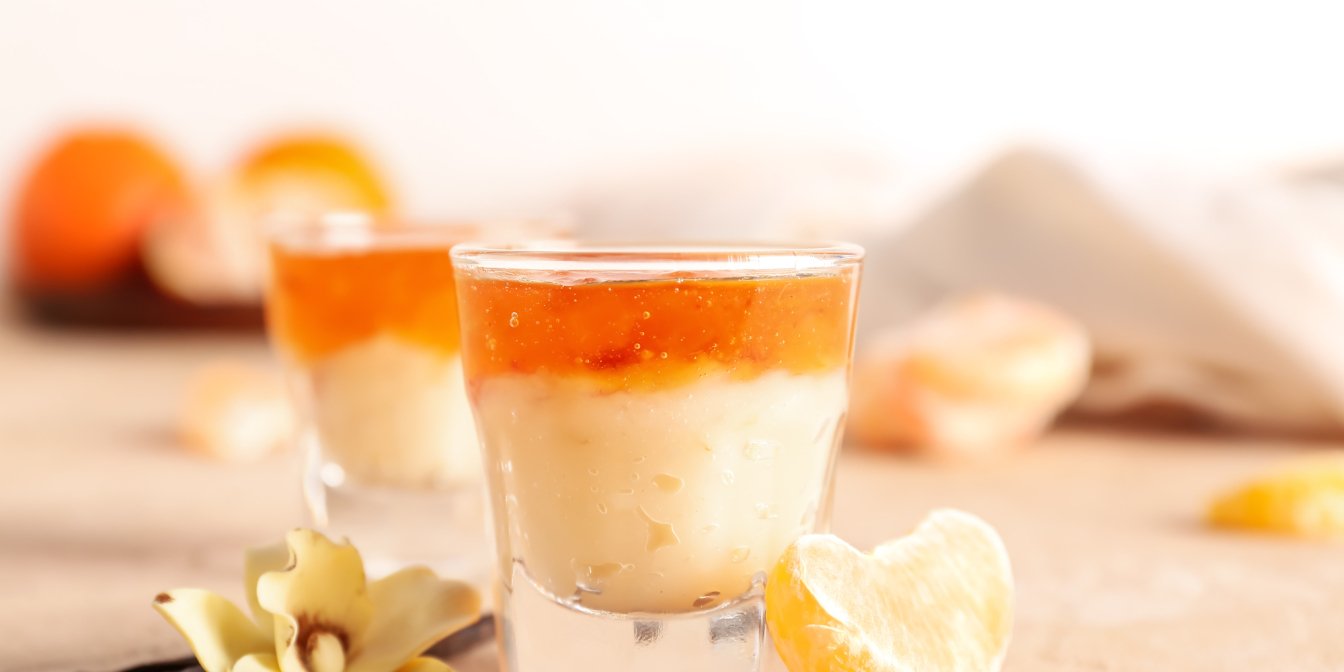 С помощью блендера смешайте мандариновый сок и сгущенку в течение 2 минут. Добавьте растворенный желатин и снова смешайте в течение 1 минуты. Добавьте цедру, смешайте.