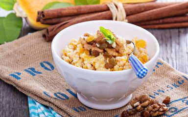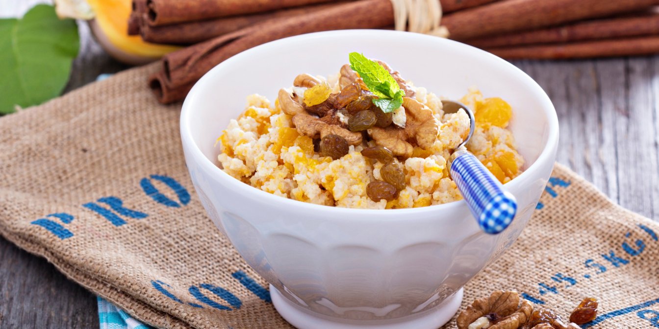 Попытайтесь приготовить пшенную кашу по нашему рецепту. Она сочетает пшено с мякотью тыквы, изюмом, черносливом, курагой и медом. Выходит очень вкусно!