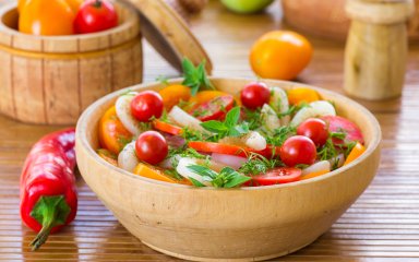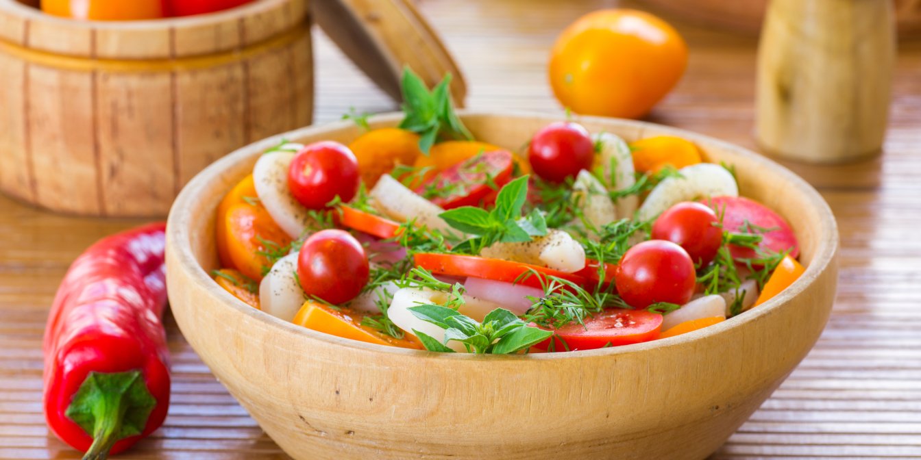 Овощи и зелень промойте и обсушите. Помидоры разрежьте пополам, огурцы нарежьте полукружками, лук очистьте и нашинкуйте. У перца удалите сердцевину, мякоть порежьте полукольцами. Листья салата порвите руками, петрушку измельчите.