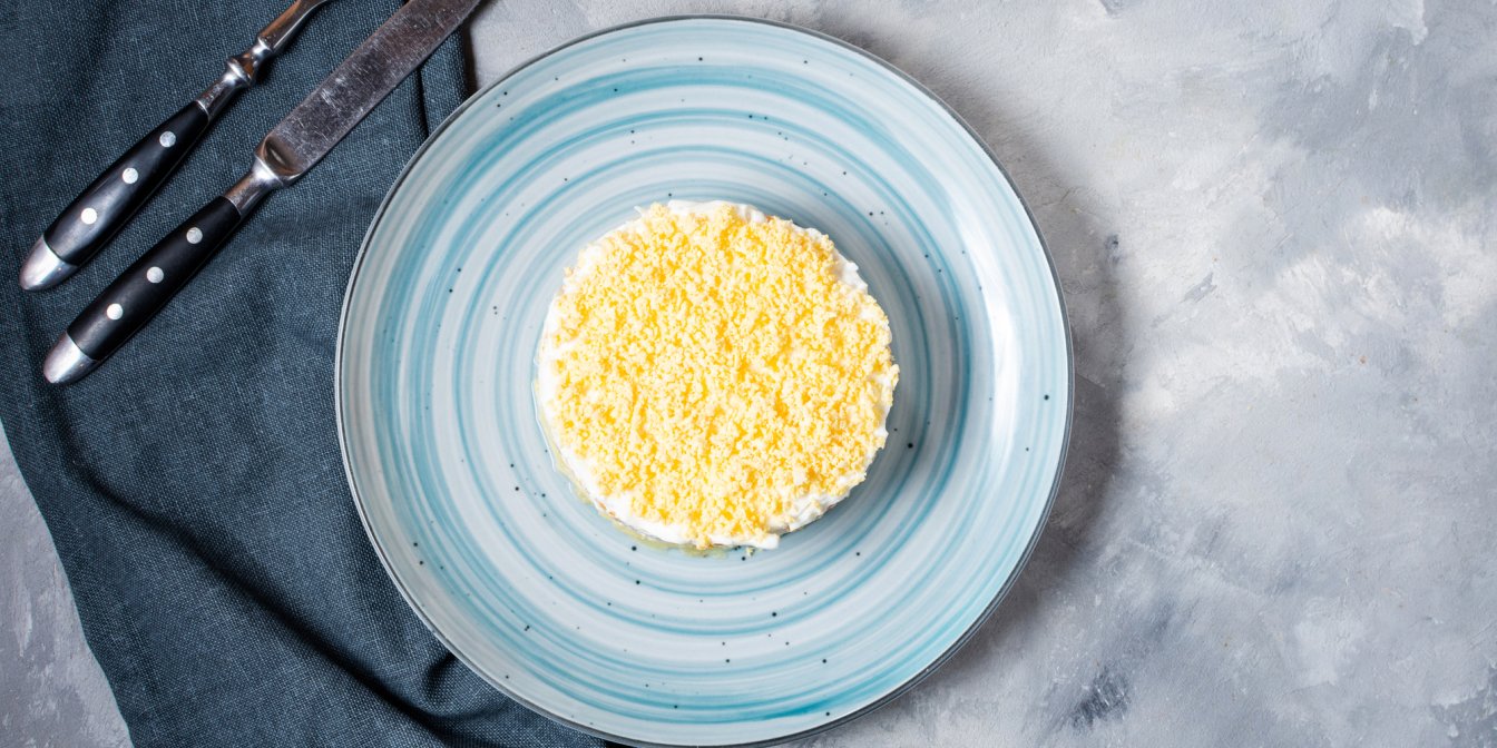 Яйца сварите вкрутую в течение 10 минут. Охладите, очистите, отделите белки от желтков. Натрите их раздельно на маленькую терку.