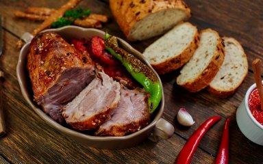 Смешайте все ингредиенты маринада. Поместите свинину в маринад и отправьте в холодильник на 12 часов.