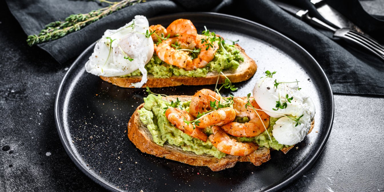 Соедините яйца, авокадо, сыр, измельченный чеснок, хрен, посолите и перемешайте. На ломтики хлеба выложите сырно-яичную массу, сверху разложите креветки, украсьте зеленью и подавайте к столу!