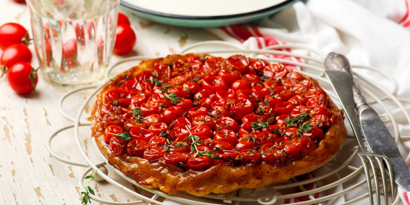 Заверните сочные маленькие томаты черри в хрустящее золотистое тесто, чтобы приготовить эту потрясающую пикантную версию классического французского тарта татена. Пирог станет звездой любого стола.