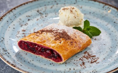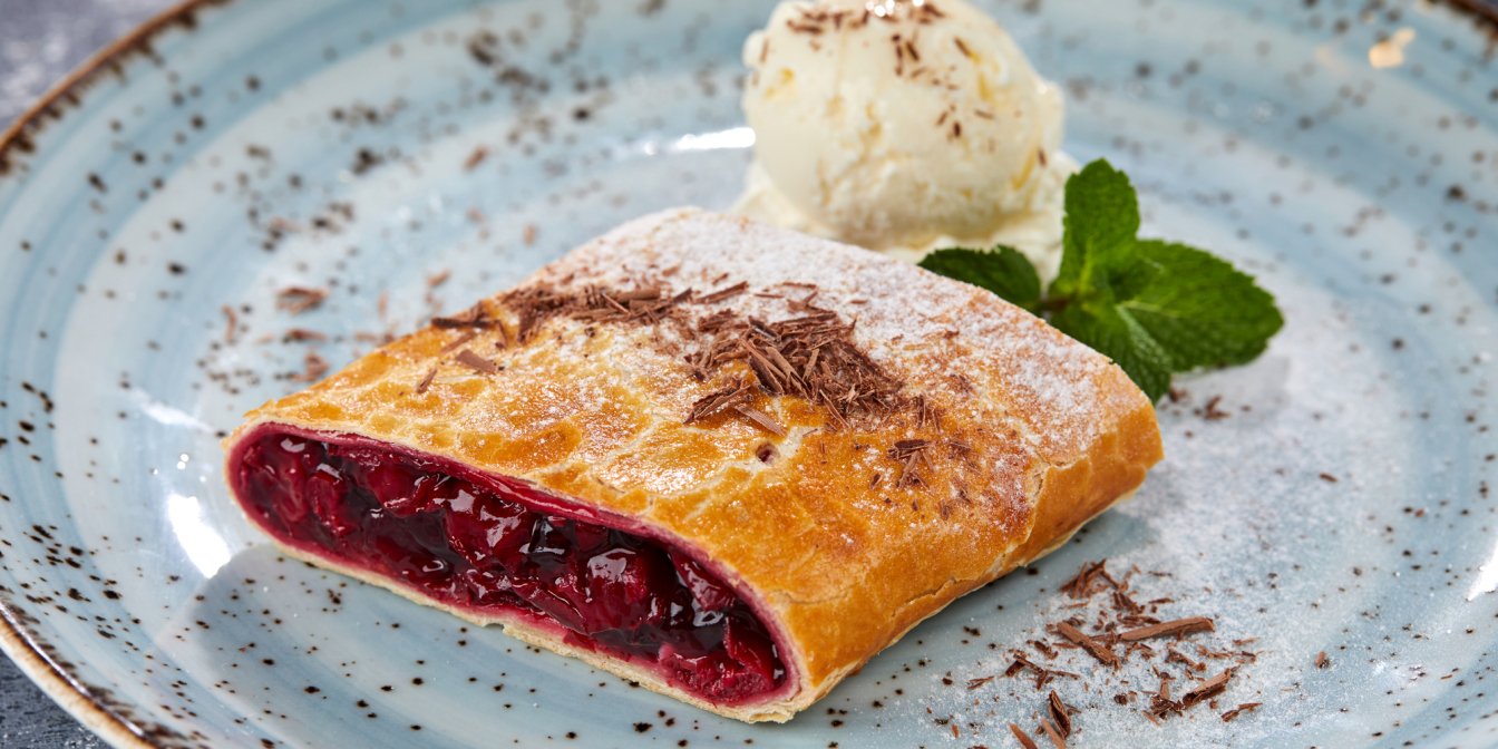 Штрудель — лучшее, что можно приготовить во время сезона вишен. Это классический десерт, который подают теплым или холодным. Он хорошо сочетается с ванильным мороженым, заварным кремом или взбитыми сливками.