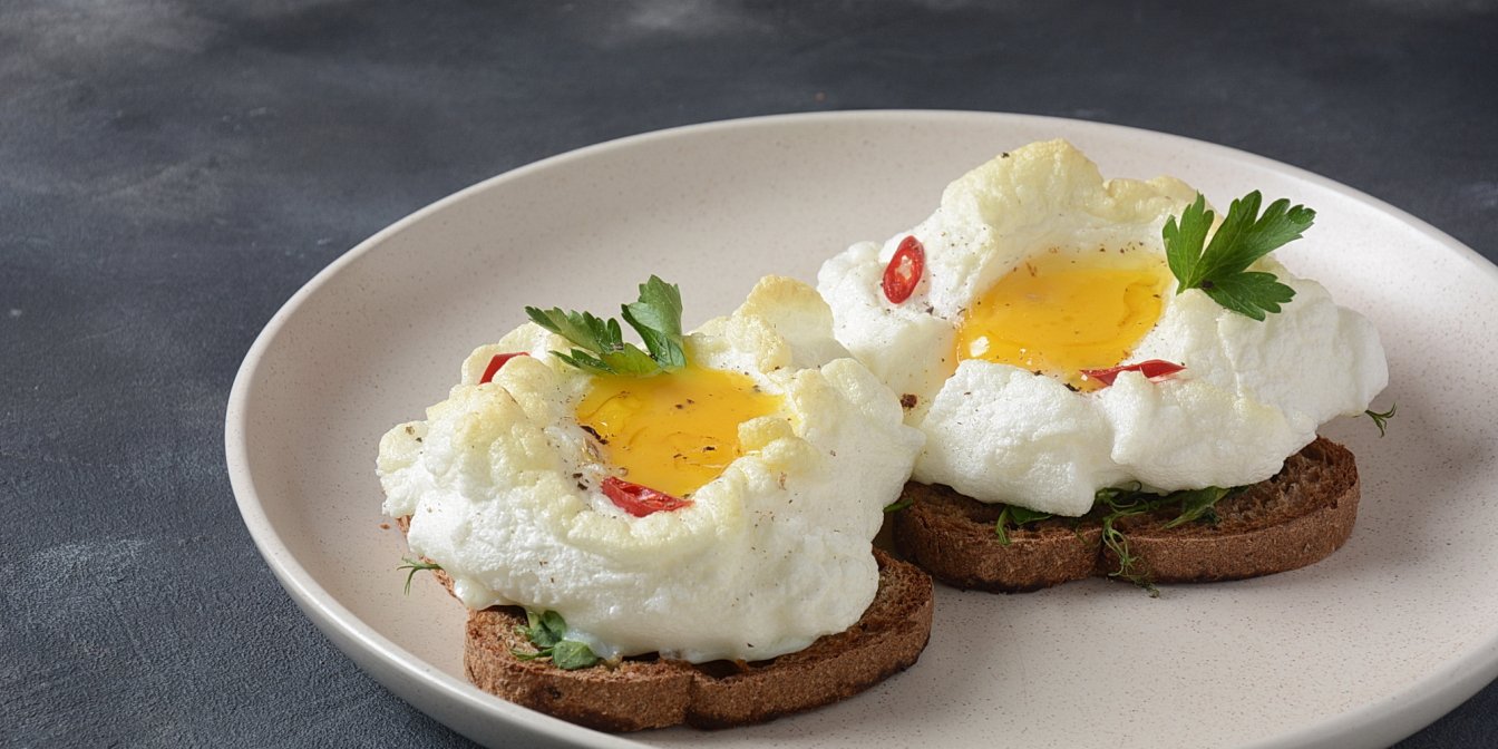 Отделите белки от желтка так, чтобы желтки не повредились. Взбейте белки со щепоткой соли до стойкой пышной пены и выложите ее на тосты.