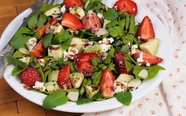 Нежный и необычный салат с клубникой в сочетании с соленой брынзой и сливочностью авокадо поразит вас сочетанием вкусов.