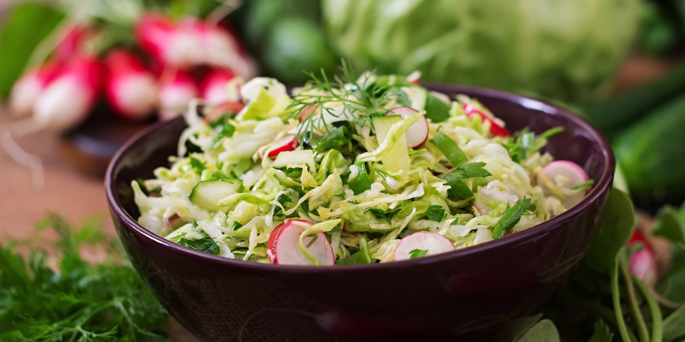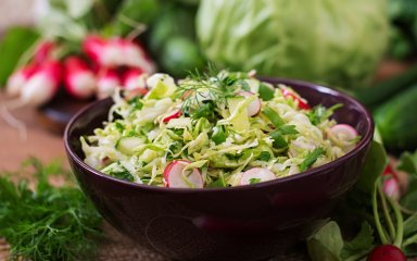 Постный салат с редиской и молодой капустой, свежий и полный полезных свойств, станет хорошим дополнением к любому основному блюду на растительной основе.