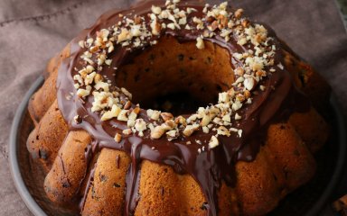 Полейте остывшую бабку шоколадной глазурью и украсьте сухофруктами и орешками.