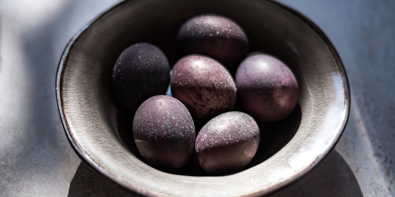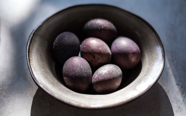 Вино окрашивает пасхальные яйца в красивый пурпурный цвет, а также придает им кристаллическую текстуру. Все, что вам нужно — это сварить яйца в красном вине и оставить их в жидкости, пока они не приобретут желаемый цвет. В зависимости от пигмента в вине яйца изменятся от голубовато-фиолетового до почти черного.