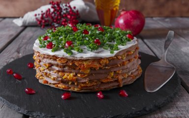 Приготовьте этот красивый многослойный печеночный торт с грибами и угостите им своих гостей.