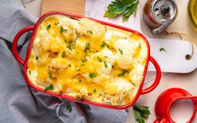 Цветную капусту разберите на соцветия, положите в кипящую подсоленную воду и варите 3 минуты. Откиньте на дуршлаг и облейте холодной водой. Выложите капусту в форму для запекания, смазанную растительным маслом.