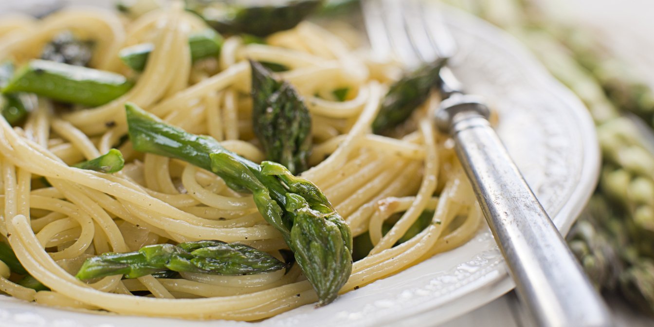 В этой простой пасте соединяются нежные хрустящие кусочки спаржи, длинные спагетти, пряный чеснок, лимон и тертый сыр пармезан. Все это готовится за 30 минут и точно станет вашим любимым обеденным блюдом.