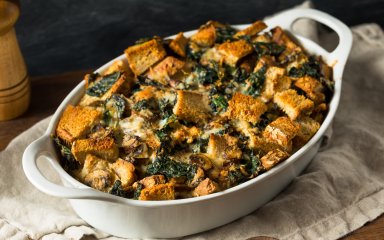 Выложите содержимое сковороды в большую форму для запекания одним ровным слоем. Сверху посыпьте сыром и полейте соусом. Готовьте в духовке в течение 40-45 минут, пока некоторые кусочки хлеба не станут хрустящими и золотисто-коричневыми. Посыпьте зеленью, подавайте.