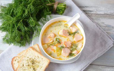 Сырный суп с красной рыбой настолько элегантен и приятен с виду, что его можно подать к праздничному столу. Для дополнения рекомендуем приготовить гренки-канапки с жареной редиской.