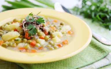 Этот суп является воплощением лета, поскольку его готовят с добавлением молодого зеленого горошка и молодой моркови. Их обычно можно найти на полках магазина или на рынке, начиная с конца мая. Все остальные ингредиенты супа не зависят от сезона.