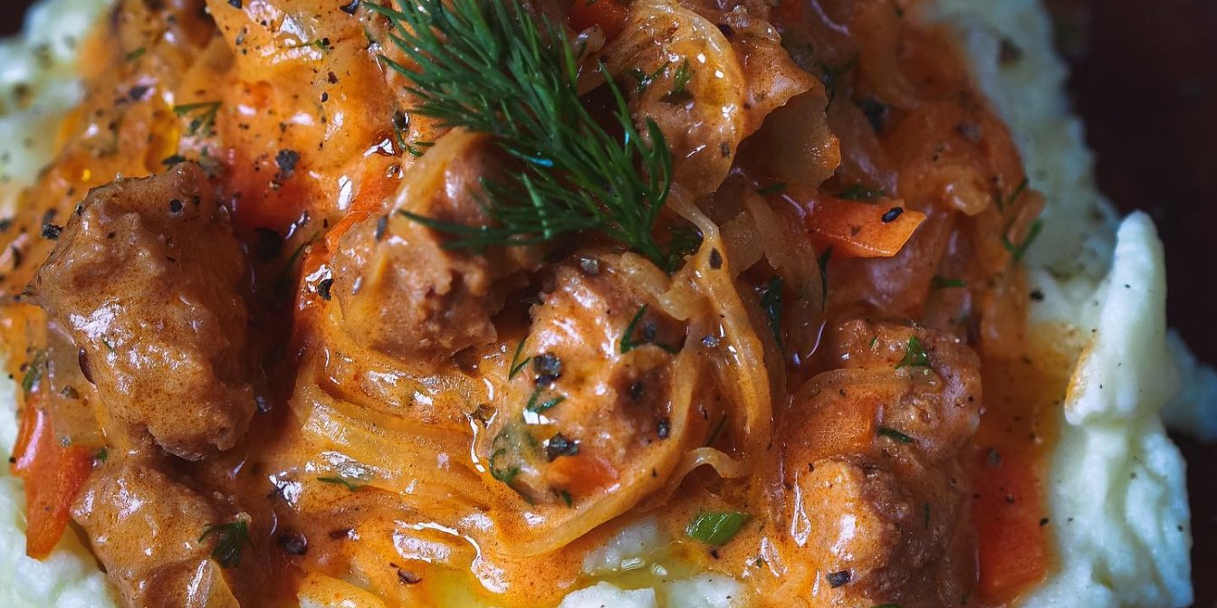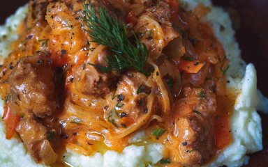 Вместо соевого сыра можно взять соевое мясо. Обязательный ингредиент — квашеная капуста, ее нужно два стакана. Подавать гуляш вкусно с картофельным пюре.
