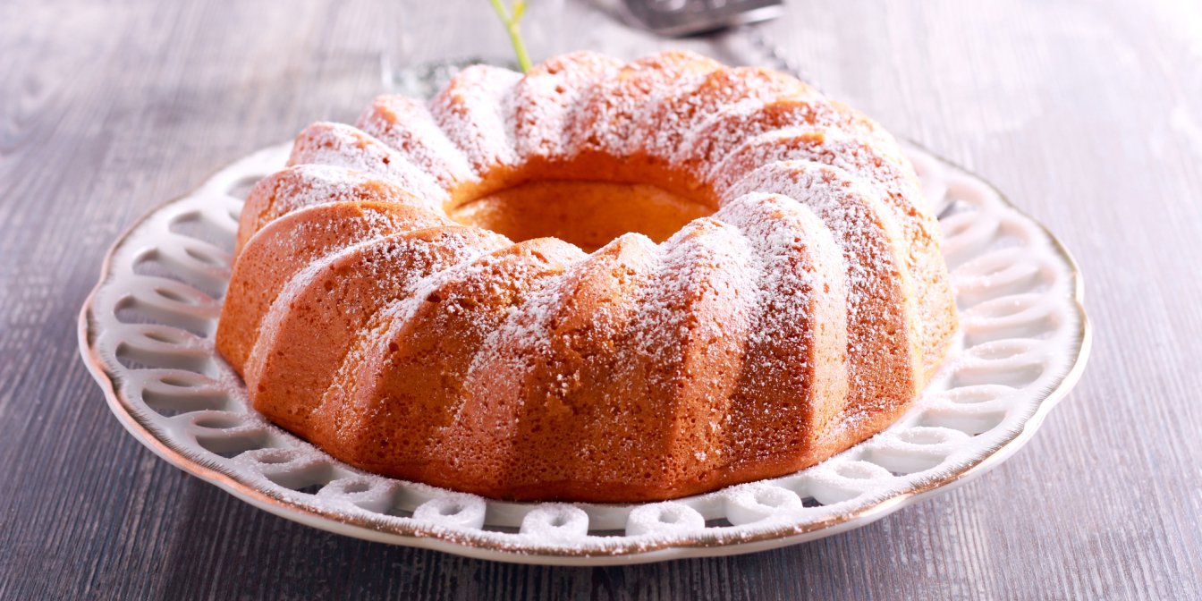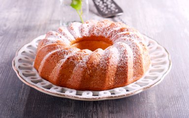 Дайте готовому кексу остыть. Затем переверните его на блюдо и посыпьте сахарной пудрой.