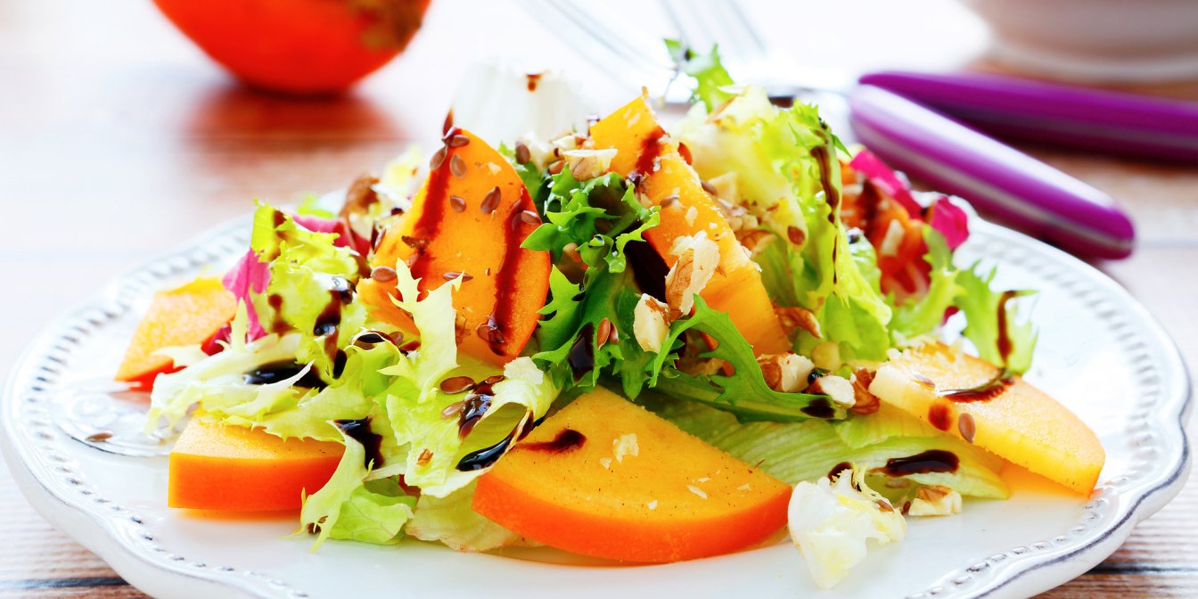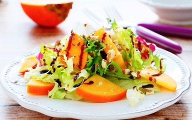 Сочетание прошутто с дыней или грушей в закусках и салатах давно стало классикой. Мы предлагаем тебе зимний вариант — с хурмой. Сладость этого оранжевого фрукта идеально сочетается с соленостью итальянской ветчины. Салат из хурмы и прошутто с ореховой заправкой покоряет сразу.