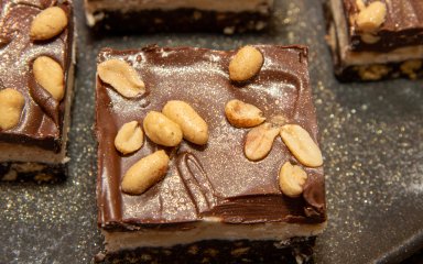 Для второго шара растопите шоколад на водяной бане, затем добавьте арахисовое масло и перемешайте до получения однородной смеси. Выложите приготовленный ганаш на корж, разровняйте и оставьте десерт остывать примерно на 4-5 часов. Нарежьте его кубиками и наслаждайтесь!