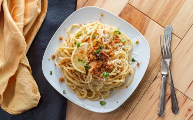 Спагетти с сырным соусом и чесночными сухариками — то, что нужно для быстрого обеда. Секрет этого блюда заключается в его невероятной сливочности и ни с чем не сравнимым вкусом выдержанного сыра.