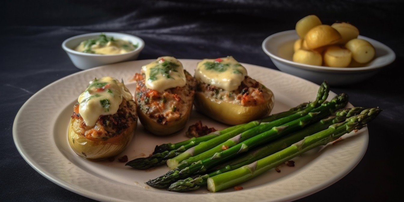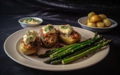 Воспользуйтесь вкусной идеей Марины из Киева, которая отдельно запекла спаржу и отдельно отварила, нафаршировала и запекла картофель, а затем собрала общее блюдо на одной тарелке. Чтобы придать блюду французский шарм, автор рецепта использовала соус бешамель.