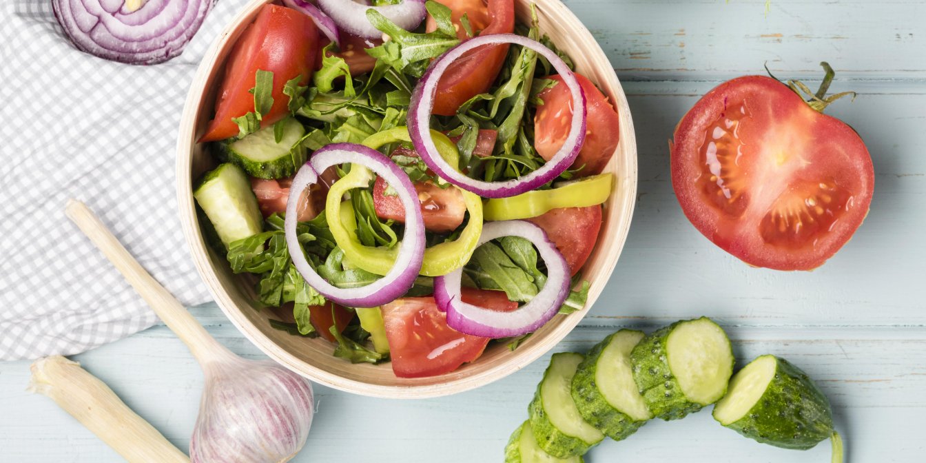 Завтрак: салат из огурцов, помидоров и перца, зелень