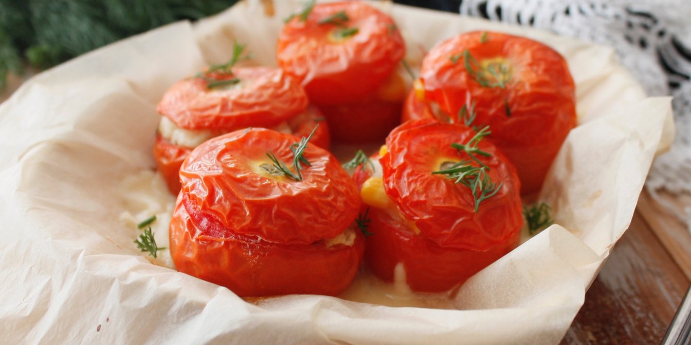 Сочные, сливочные и нежные фаршированные помидоры готовы за несколько минут запекания в духовке.
