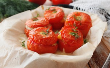 Приготовьте вкусные фаршированные помидоры с начинкой из творога, сливок, яиц и специй. Закуска, немного отличающаяся от классических фаршированных помидоров, также подходит для вегетарианцев, готовится легко и быстро.