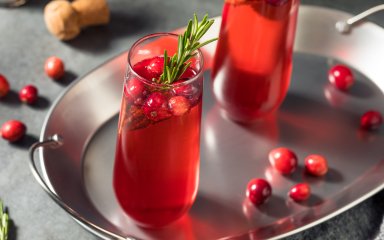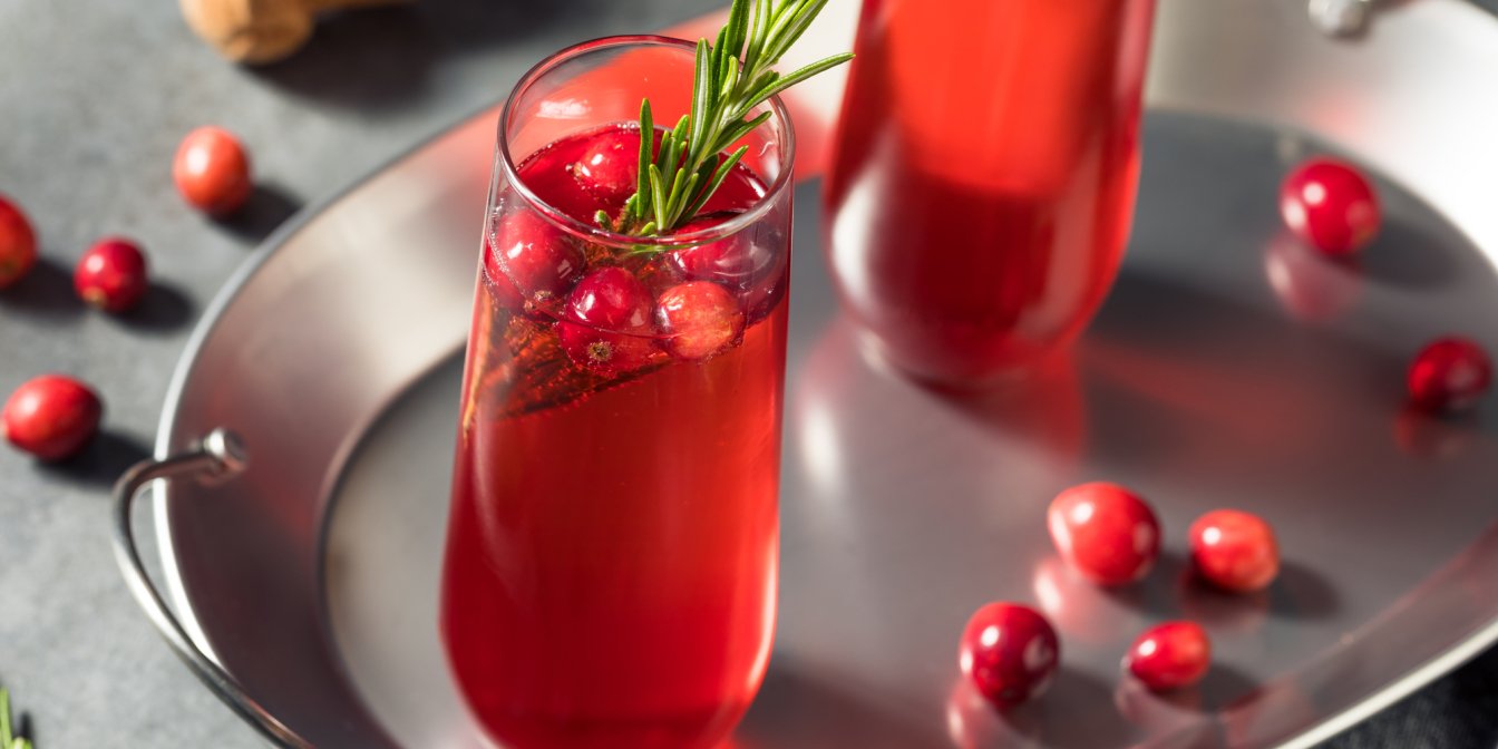 В охлажденные бокалы для шампанского налейте чуть-чуть клюквенного сока, капельку сока лайма и заполните просекко.