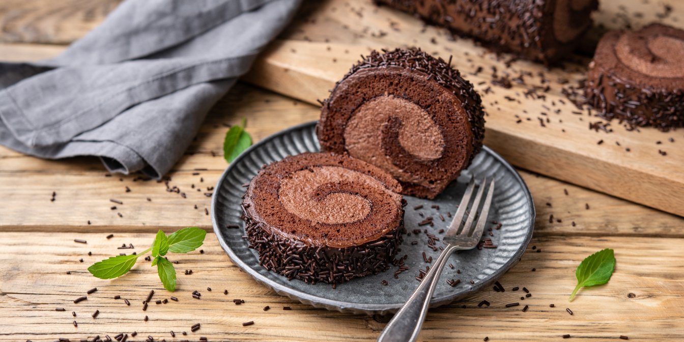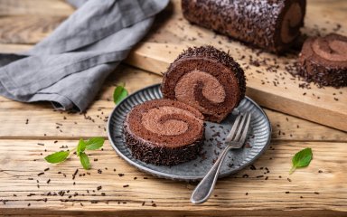 Французский шоколадный рулет, изготовленный из пористого шоколадного бисквита с начинкой из густых взбитых сливок, — это лучший десерт для чаепития.