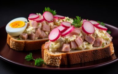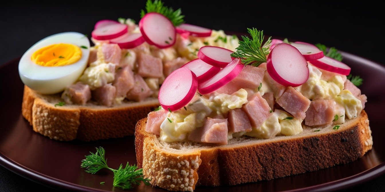 Вкусное сочетание ветчины, яиц, зеленого лука и редиса с майонезно-горчичной заправкой намазывают на хлеб с маслом. Отличный вариант для питательного завтрака или быстрого ужина!