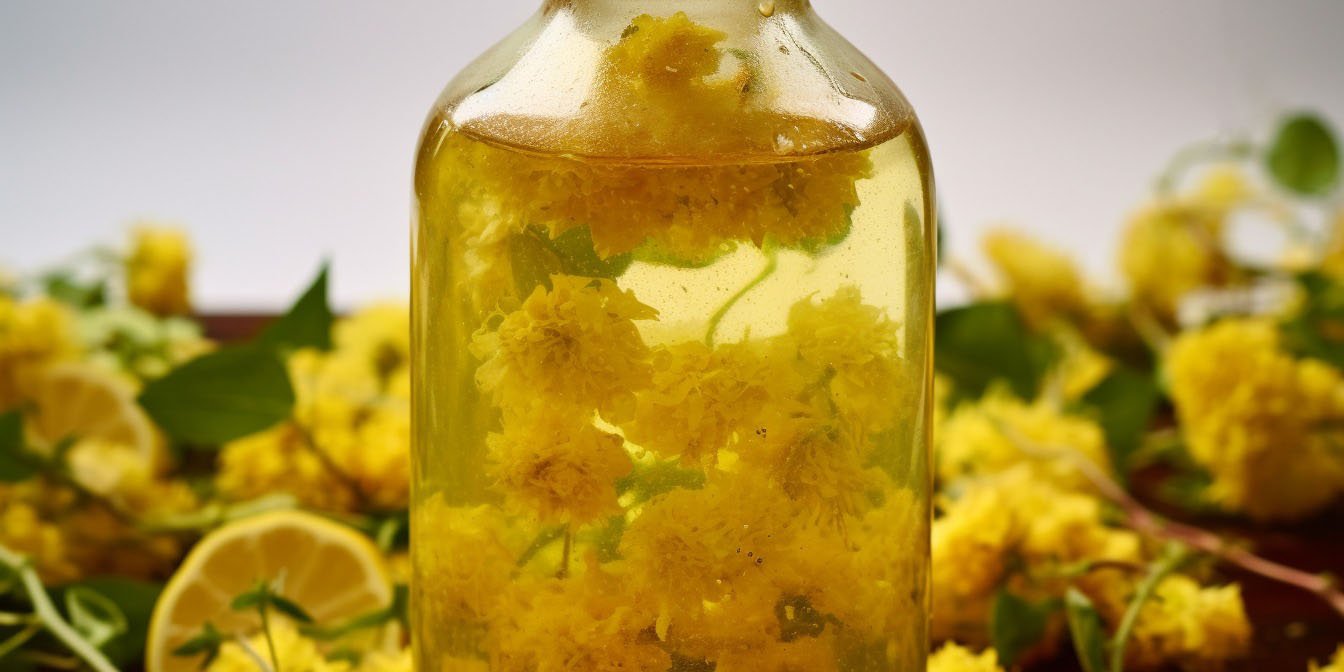 Пока сироп остывает, переберите липовый цвет от насекомых и мусора. Не мойте цветы. Отрежьте ножницами цветки от зеленовато-желтого прицветника. Вам понадобится 1,5 стакана цветов. Поместите цветы в банку или бутылку с широким горлышком объемом 500 мл или несколько баночек меньшего размера и залейте доверху сиропом. Перемешайте, чтобы цветы погрузились в сироп.