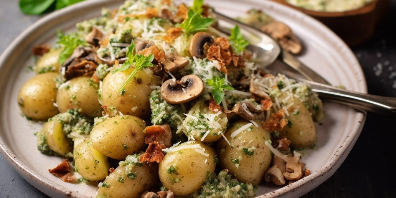 Летом единственное блюдо, без которого не обойдется ваше повседневное меню — это салаты. Когда, как не в теплое время года, наслаждаться многообразием сезонных овощей? Сочетание грибов и картофеля для салата очень удачное, а приправленное соусом песто будет смаковать еще лучше.