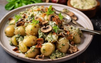 Салат с картофелем, грибами и соусом песто — то, что вам нужно на летний ужин. Нежный картофель, ароматные грибы и насыщенный песто делают свое дело.