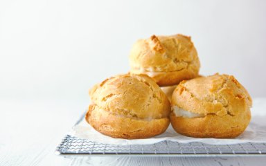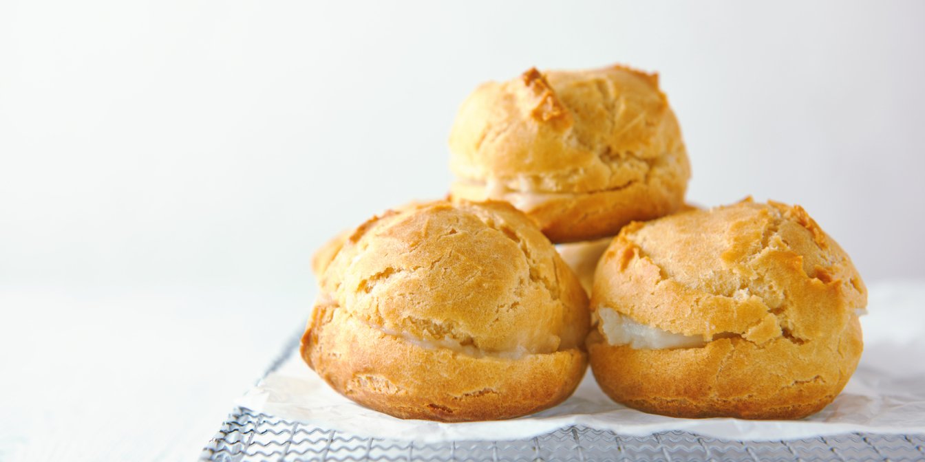 Выложите тесто в кондитерский мешок и выдавите его порциями на противень, застеленный пергаментом. Выпекайте в разогретой до 180°C духовке 20 минут до появления золотистого цвета. Дайте профитролям остыть.