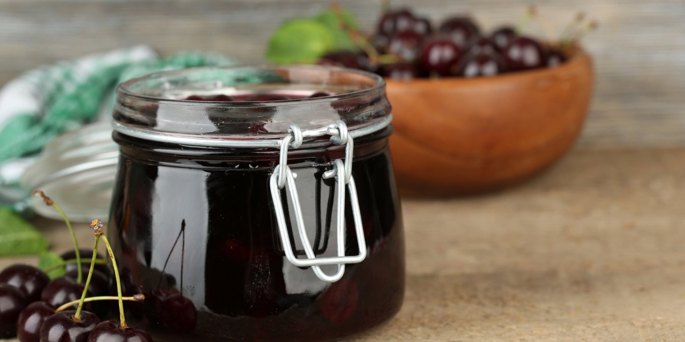 Вишневый конфитюр — это сладкая и густая намазка, приготовленная из спелых ягод, сахара и загустителя (у нас «Желфикс»). Для аромата мы также добавляем лимон и корицу.