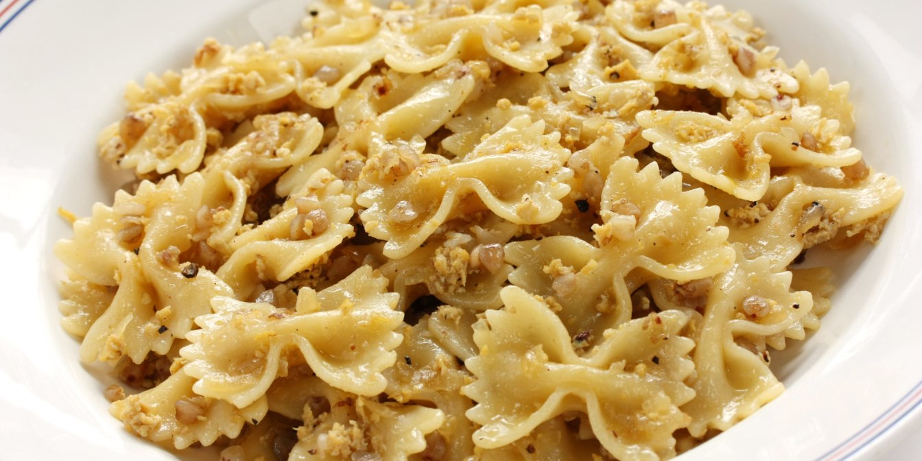 Отварите фарфале согласно инструкции на упаковке до состояния al dente. Слейте с макарон воду и добавьте лук, перемешайте. Добавьте гречку, перемешайте и прогрейте.