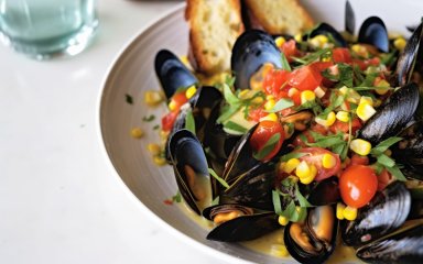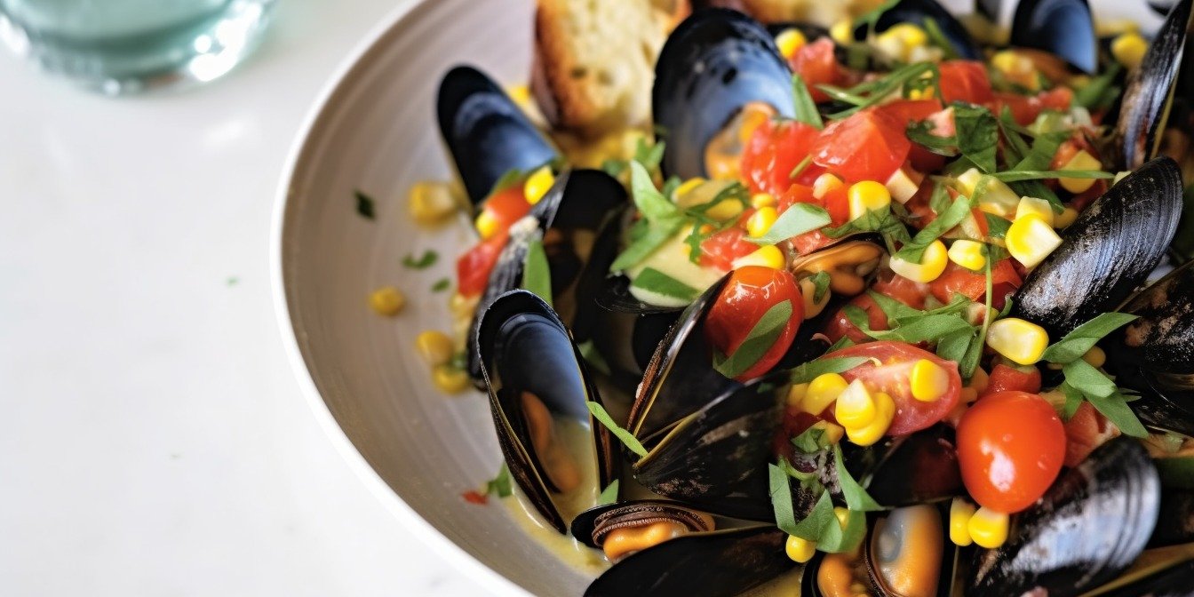 Мидии с кукурузой, помидорами черри и эстрагоном