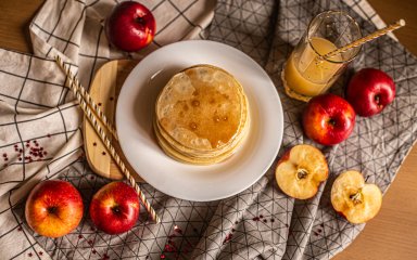 В этом рецепте панкейков можно заменить сахар медом или совсем его не добавлять (если готовите для детей и выбрали сладкий сорт яблок). Также панкейки станут более диетическими и полезными, если вы выберете цельнозерновую или рисовую муку. Но SHUBA остановится на классике.