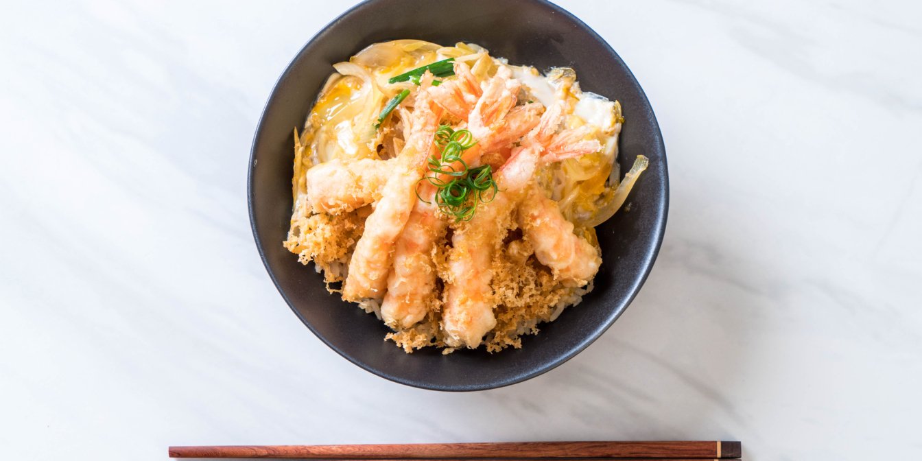 Донбури с креветками — это традиционное японское блюдо, состоящее из риса, креветок в темпуре и овощей, покрытых пикантным соусом.