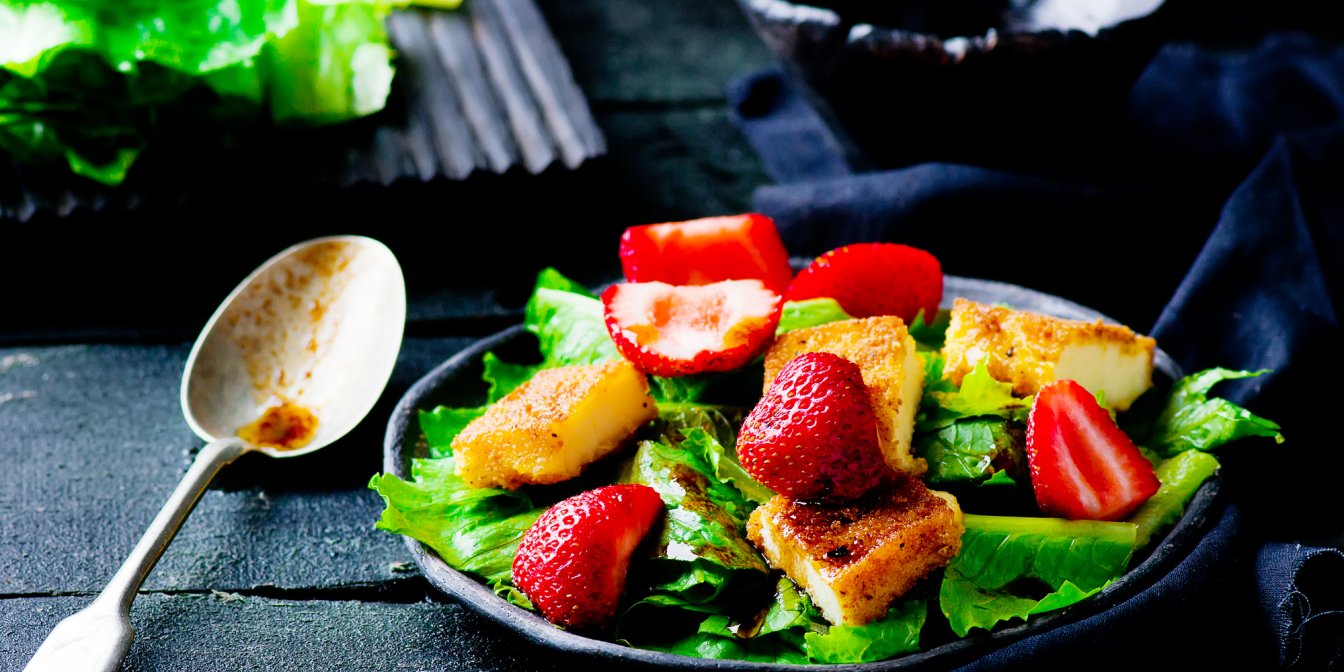 SHUBA советует выбрать сыр маасдам для этого рецепта — он имеет сливочный вкус, в меру сладкий и при жарке хорошо плавится. Этот салат будет пряно-сладким благодаря сочетанию заправки и сладкой спелой клубники. Салатную зелень можно использовать любую — попробуйте рукколу, шпинат, салат айсберг и т. д. А вот еще несколько рецептов салатов на каждый день: