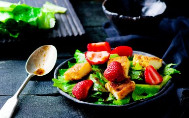 Невероятно вкусный летний салат с клубникой и жареным сыром можно подать как на праздничный стол, так и приготовить на обед. Кстати, по тому же принципу вы можете приготовить курицу и добавить ее в салат.