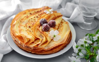 Блинчики следует жарить на медленном огне до золотистой корочки. Подавать блюдо можно с ягодами или карамельной помадкой.