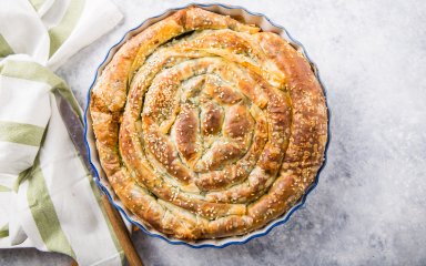Вкусный пирог со слоями тонкого и хрустящего теста фило и сочной начинки из шпината и сыров.