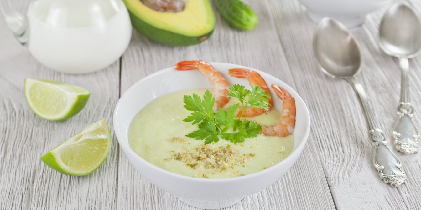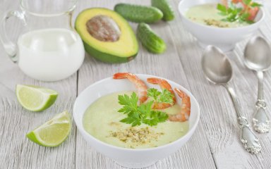 Для вкусного холодного супа с авокадо и креветками нам понадобится овощной бульон, кокосовое молоко и молоденький кабачок. Процесс приготовления будет простым, а результат изысканным. Мы приготовим крем-суп из авокадо и кабачка и добавим в него целые обжаренные с острым перцем креветки.